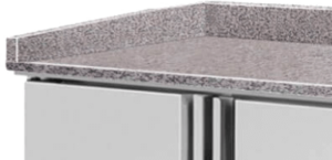- Arbeitsplatte mit Aufkantung, um eine Aufsatzkühlvitrine aufzustellen. Darunter bleibt die volle Arbeitsfläche erhalten.