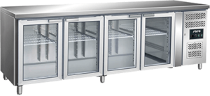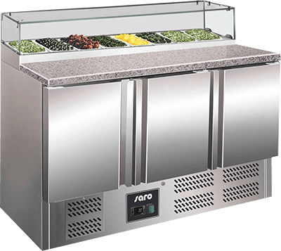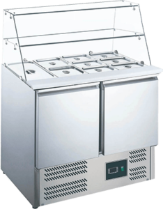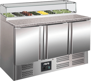 Es lassen sich passende GN-Behälter einhängen, welche gleichzeitig gekühlt werden. Ein Pizzakühltisch mit Glasaufsatz ermöglicht Sichtkontakt für den Kunden, welcher dadurch individuell seine Zutaten auswählen kann.