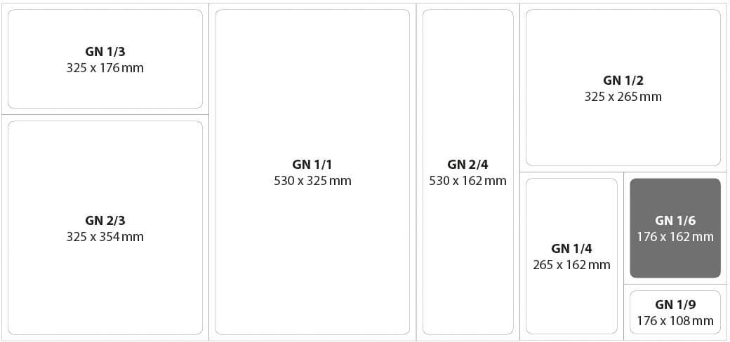 Die Außenmaße der GN-Behälter unterliegen der DIN-Norm. In unserem Abbild findest du unsere Varianten der GN-Norm mit den dazugehörigen Maßen