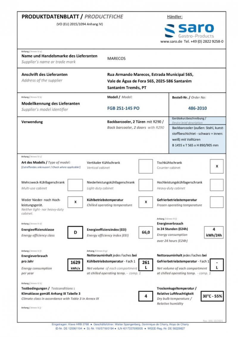 SARO Backbarcooler, 2 Türen, Modell FGB 251-145 A PO