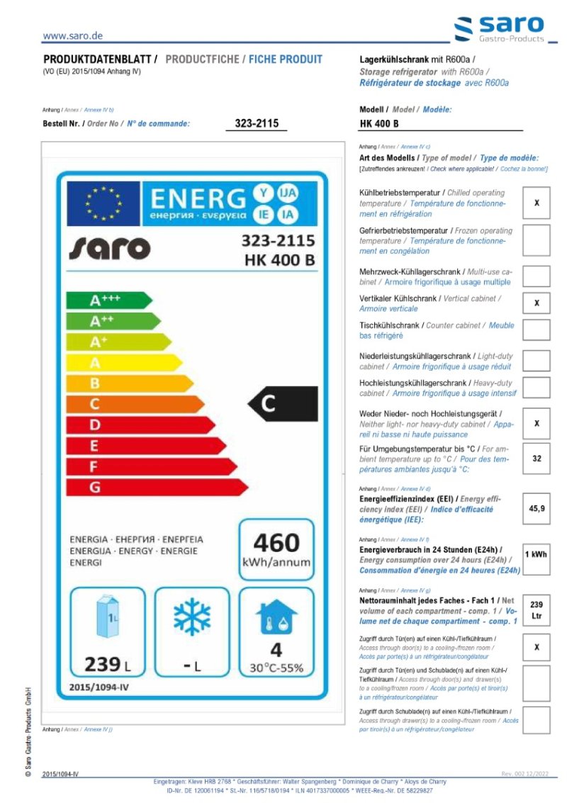 SARO Lagerkühlschrank - weiß, Modell HK 400