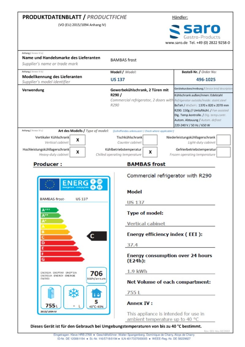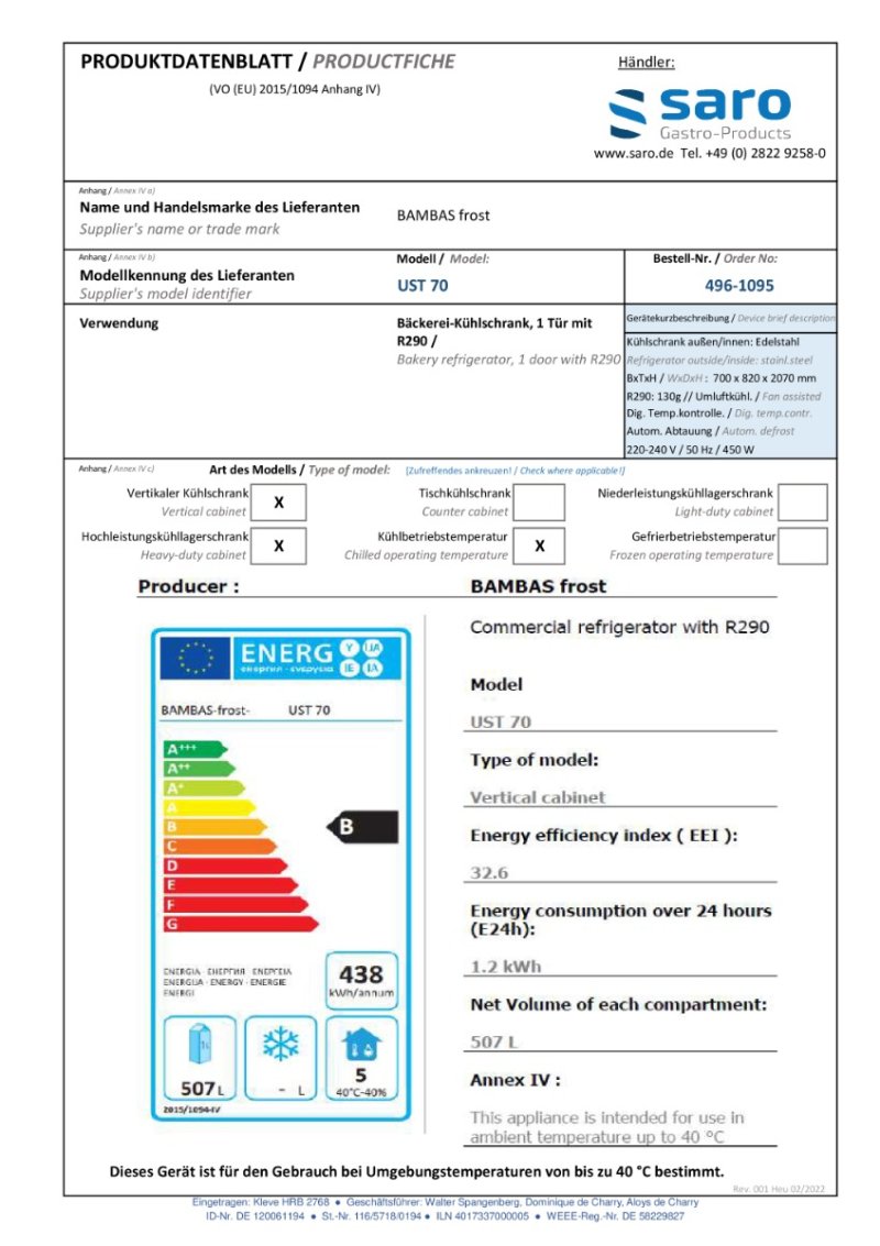 • SARO Bäckerei-Kühlschrank Modell EPA 800 TN