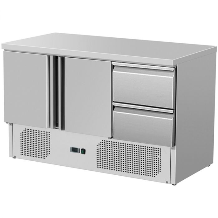 Der Kühltisch ZS 903 2 D mit zwei Türen und zwei Schubladen findet seinen Einsatz sowohl in Thekenbetrieben, als auch in Restaurantküchen. Der 3-Seitig eingeschäumte Verdampfer in kombination mit dem Umluftventilator sorgt für ein gleichmäßiges Kühlergebnis. Alle Einstellungen lassen sich über das integrierte, digitale Thermostat vornehmen und an Ihre Bedürfnisse anpassen.