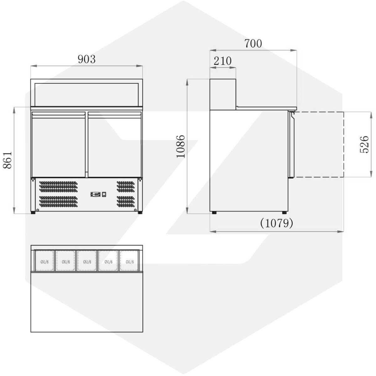Der Pizzatisch ZPS 900 verfügt über zwei Türen sowie einem GN-Einlass für bis zu 5x 1/6 GN-Behälter. Die in den GN-Behältern gelagerten Waren werden durch den Einlass in den Kühlkorpus indirekt mit gekühlt. Neben einem Leistungsstarken Kompressor ist das Gerät mit einem digitalen Markenthermostat ausgestattet.