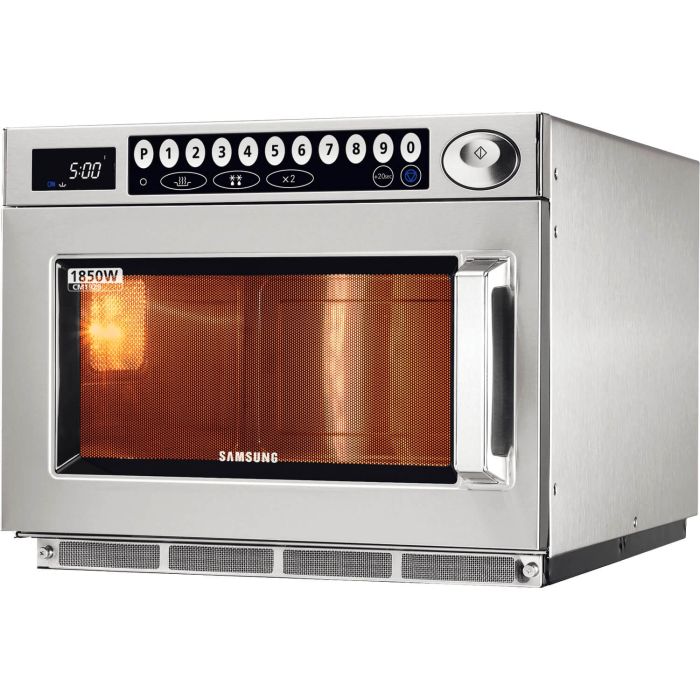 Der Mikrowellenherd der Marke Samsung Modell CM1929A verfügt über fünf Leistungsstufen für bis zu 1850 Watt. Das doppelte Magnetron sorgt für ein gleichmäßiges Garergebnis. Mithilfe der integrierten Speichertasten lassen sich bis zu 30 Programme hinterlegen und jederzeit abrufen. Zur erleichterten Reinigung wurde eine spülmaschinenfeste Deckenverkleidung integriert.