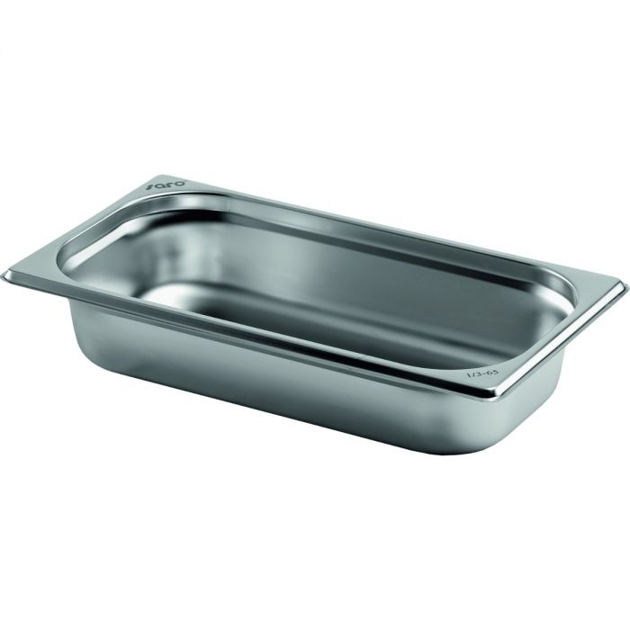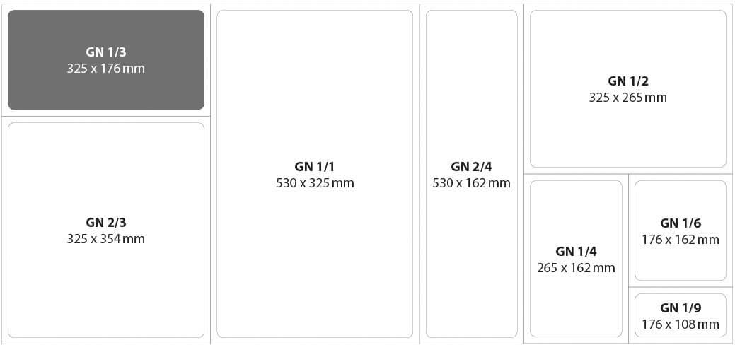 Gastronormbehälter im GN-Maß 1/3 haben eine Größe von 176x325 mm. Je nach GN Tiefe verfügen diese über ein Volumen von 0,75 bis 7,8 Litern. GN-Behälter sind in den Tiefen von 20 - 200 mm verfügbar. Gastronormbehälter im 1/3 Maß eignen sich ideal zur Lagerung von Speisen in Saladetten oder Aufsatzkühlvitrinen sowie Chafing Dishes im GN-Maß.