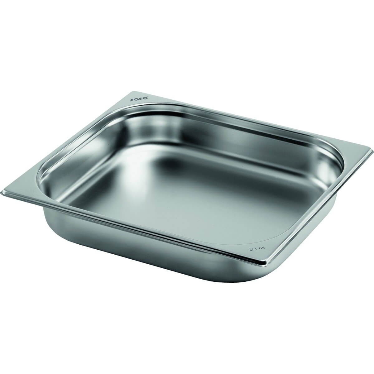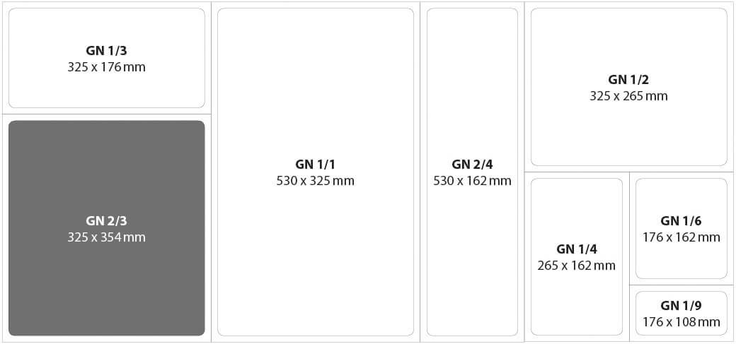Gastronormbehälter im GN-Maß 2/3 haben eine Größe von 354x325 mm. Je nach GN Tiefe verfügen diese über ein Volumen von 1,5 bis 18 Litern. GN-Behälter sind in den Tiefen von 20 - 200 mm verfügbar. Gastronormbehälter im 2/3 Maß eignen sich ideal zur Lagerung von Speisen in Saladetten oder Pizzatischen mit entsprechenden GN-Aufnahmen.