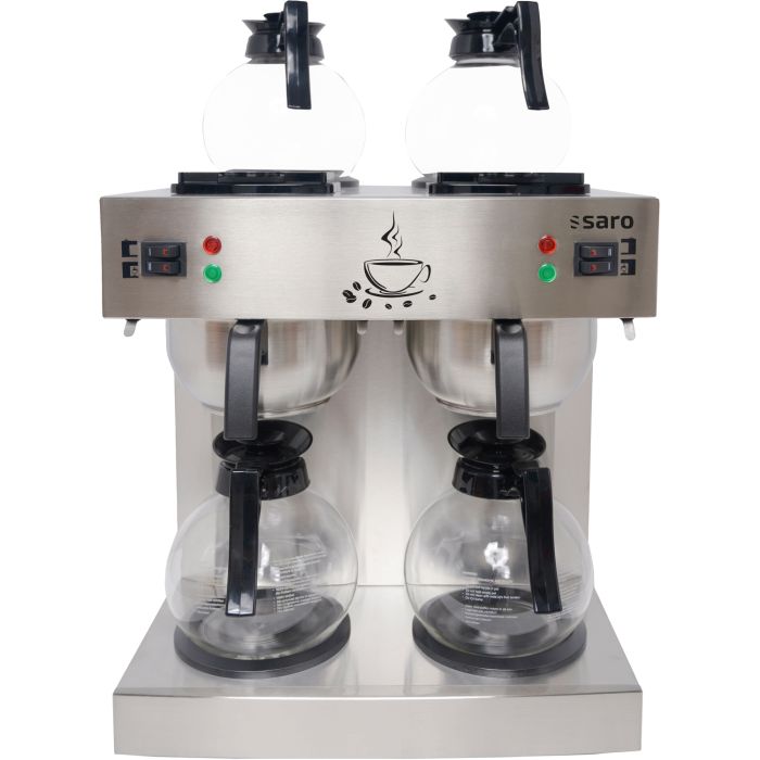Saro Kaffeemaschine ECO 48 Doppelbrühsystem für hohe Kapazität Die Saro Kaffeemaschine Modell ECO 48 aus Edelstahl bietet zwei separate Brühstationen mit insgesamt vier 1.8-Liter Glaskannen (ca. 4x 12 Tassen). Mit Brühzeit von nur 5 Minuten. 93-96°C Brühtemperatur. Trockenlaufschutz sowie 2 Brüh- und 4 Warmhalteplatten ideal für Gastronomie & Großveranstaltungen. Separate Stromanschlüsse sorgen für flexible Nutzung.