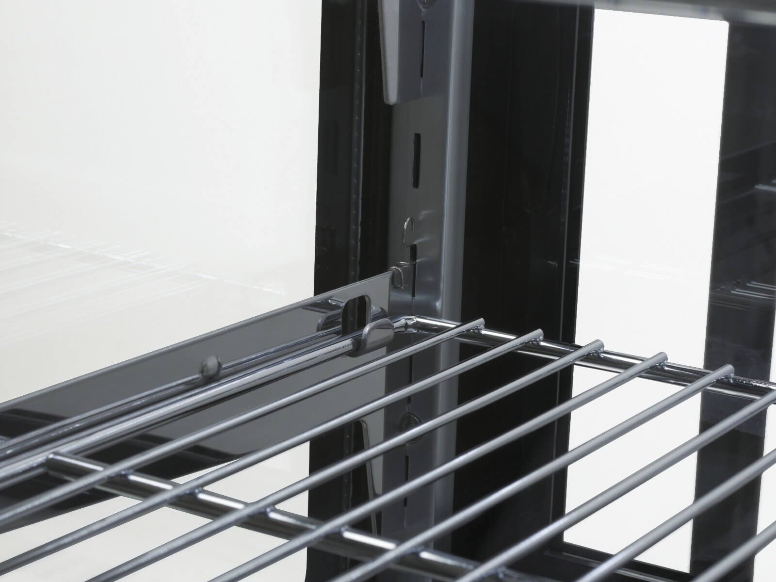 Die Kühlvitrine mit 120 Litern verfügt neben der Ablagemöglichkeit am Boden des Gerätes über zwei zusätzliche Roste. Diese lassen sich nach Belieben in der Höhe variieren und ermöglichen so aufrechtes und liegendes präsentieren Ihrer Kühlprodukte.