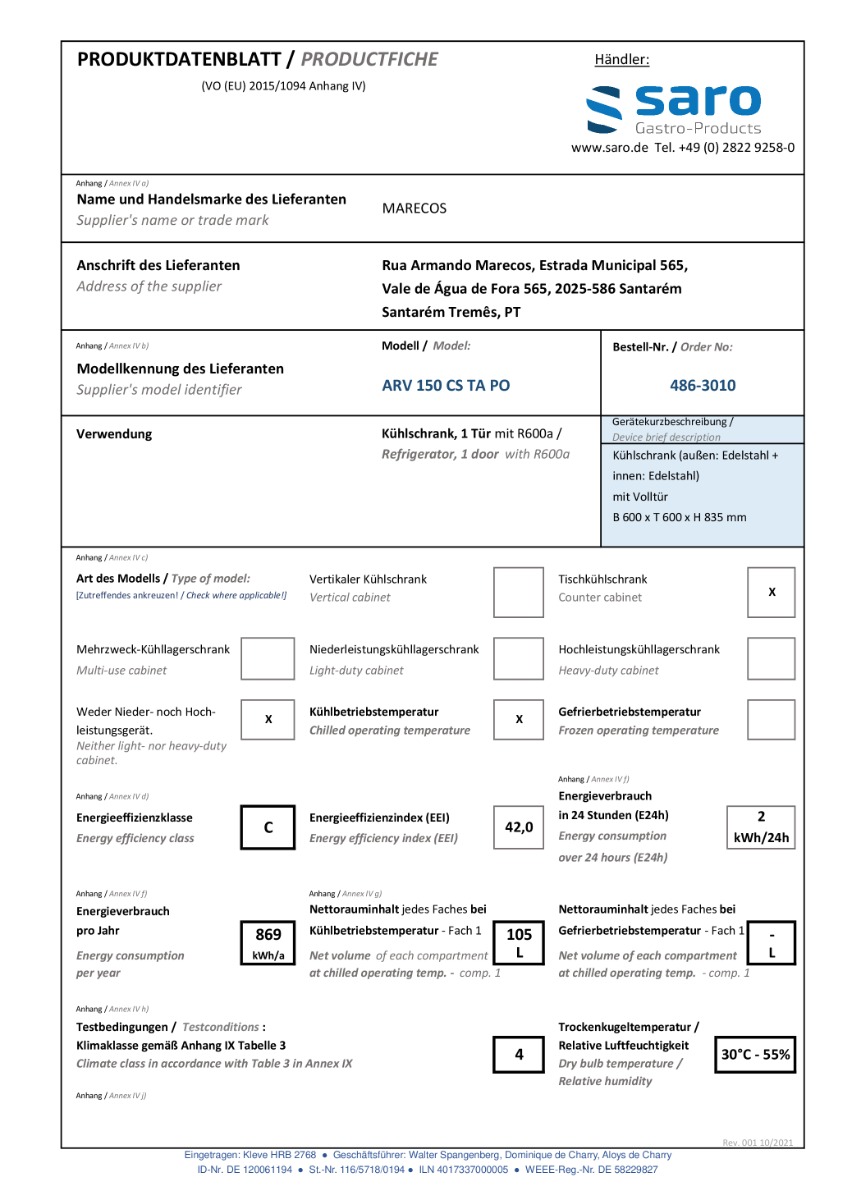 SARO Kühlschrank Modell ARV 150 CS TA PO