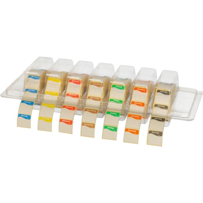 Die Aufkleber zur Lebensmittelbeschriftung Modell STICKY-1 lassen sich nach dem Beschriften rückstandslos beim Waschprozess entfernen. Die sieben Rollen von Montag bis Sontag lassen sich zudem beschriften und sorgen für Ordnung Ihrer zu lagernden Lebensmitteln.