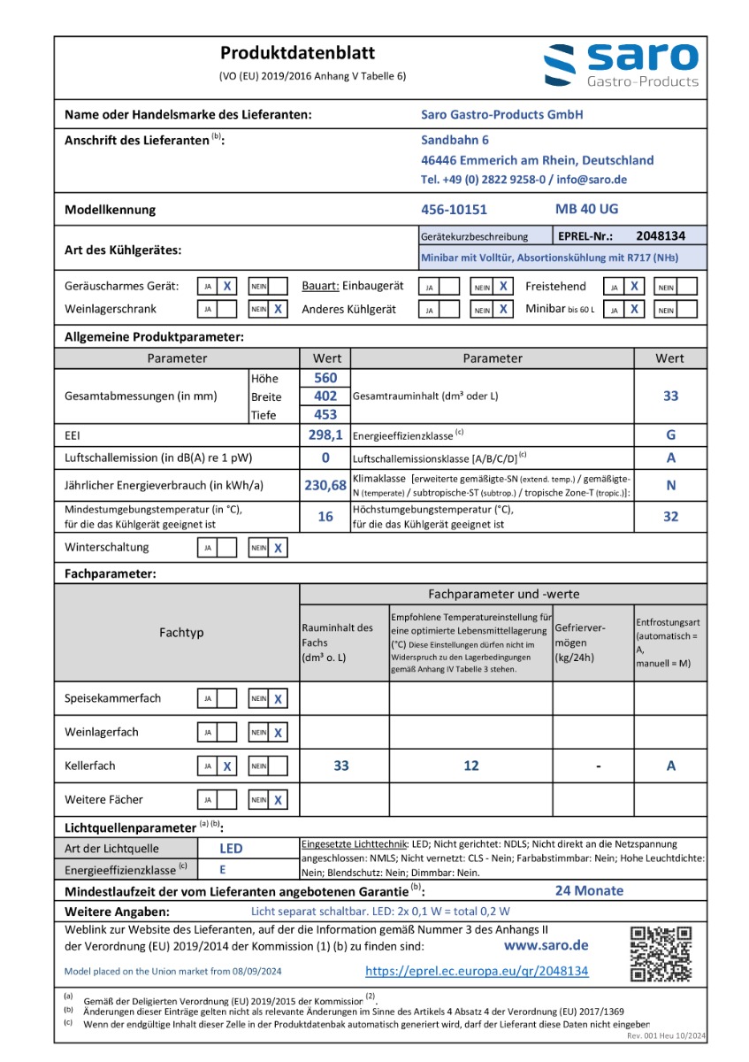 SARO Minibar mit Glastür, Modell MB 40 G