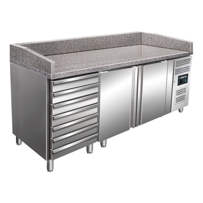Mit sieben ungekühlten Schubladen und einem doppeltürigen gekühlten Innenraum eignet sich der Pizzatisch MARGA PZ 2610 TN ideal für Pizzerien und Imbissbetriebe, in denen Waren frisch vor dem Kunden zubereitet werden. Die großzügige Granitarbeitsplatte mit Aufkantung eignet sich ideal zum kombinieren mit Aufsatzkühlvitrinen. Der Kompressor lässt sich über eine separate Klappe warten und reinigen.