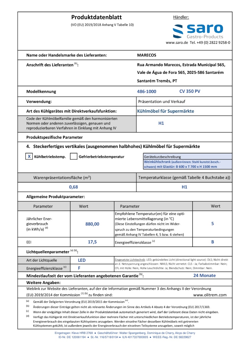 SARO Weinkühlschrank mit Glastür, Modell CV 350 PV