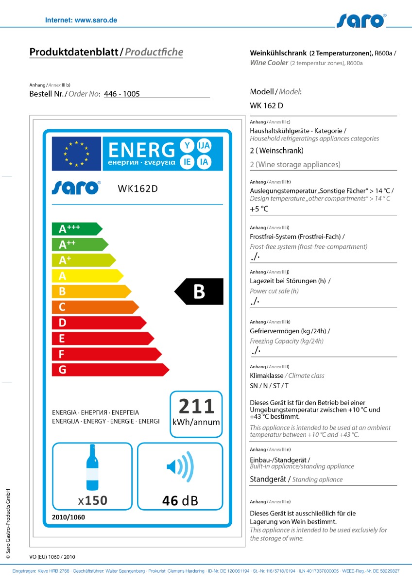 SARO Weinlagerschrank für 154 Flaschen, 2 Zonen, Modell WK 162 D