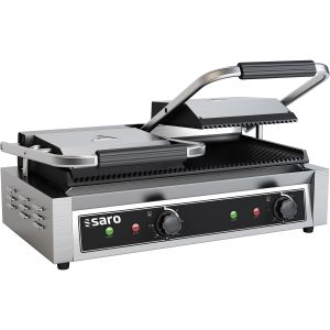 Unser Gastro Kontaktgrill ist ein unverzichtbarer Allrounder und punktet mit seinen vielseitigen Einsatzbereichen vom Imbiss bis zur Großküche. Auch ist die Nutzung des Kontaktgrills für Zuhause als Elektrogrill oder Tischgrill indoor wie outdoor hervorragend und ideal geeignet. Dank der Grillplatten aus massivem Gusseisen lässt sich der Kontaktgrill einfach und schnell reinigen und benötigt keine Vorheizzeiten zwischen den Grilldurchgängen. Die Rillen der gusseisernen Grillplatten des Gastro Kontaktgrills ermöglichen eine fettarme und schonende Zubereitung. Der Schwenkmechanismus der oberen Grillplatte ist so konzipiert, das jede beliebige Speise nicht zerdrückt wird und eine gleichmäßige Auflagefläche entsteht. Mit einer Maximaltemperatur von 300°C lässt sich ein perfektes Steak grillen, die Minimaltemperatur von 50°C verspricht andererseits schonendste Zubereitung auch von Gemüse.