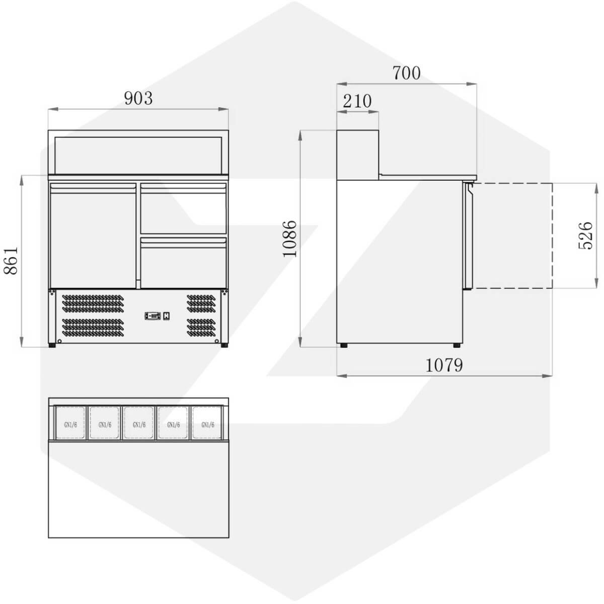 Der Pizzatisch ZPS 900 verfügt über eine Türe und zwei Schubladen sowie einem GN-Einlass für bis zu 5x 1/6 GN-Behälter. Die in den GN-Behältern gelagerten Waren werden durch den Einlass in den Kühlkorpus indirekt mit gekühlt. Neben dem leistungsstarken Kompressor ist das Gerät mit einem digitalen Markenthermostat ausgestattet.